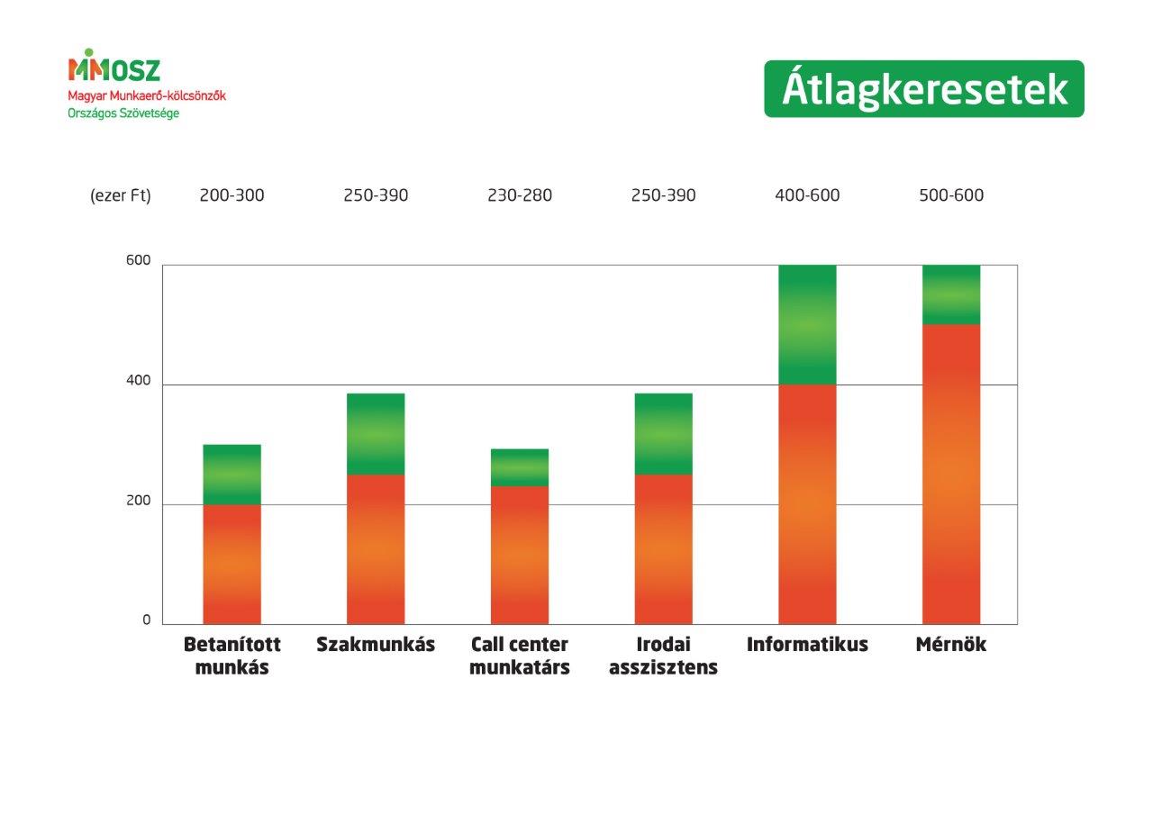 A betanított munkások bruttó átlagkeresete 200-300 ezer forint, a szakmunkásoké 250-390 ezer forint, call centeres állásban 230-280 ezer forint, irodai asszisztens pozícióban 250-390 ezer forint, mérnöki diplomával 500-600 ezer forint, s informatikusként 400-600 ezer forint.* Kik közül utóbbiakat a legnehezebb toborozni, ha egyáltalán sikerül - derül ki a Magyar Munkaerő-kölcsönzők Országos Szövetsége (MMOSZ) friss kutatásából.