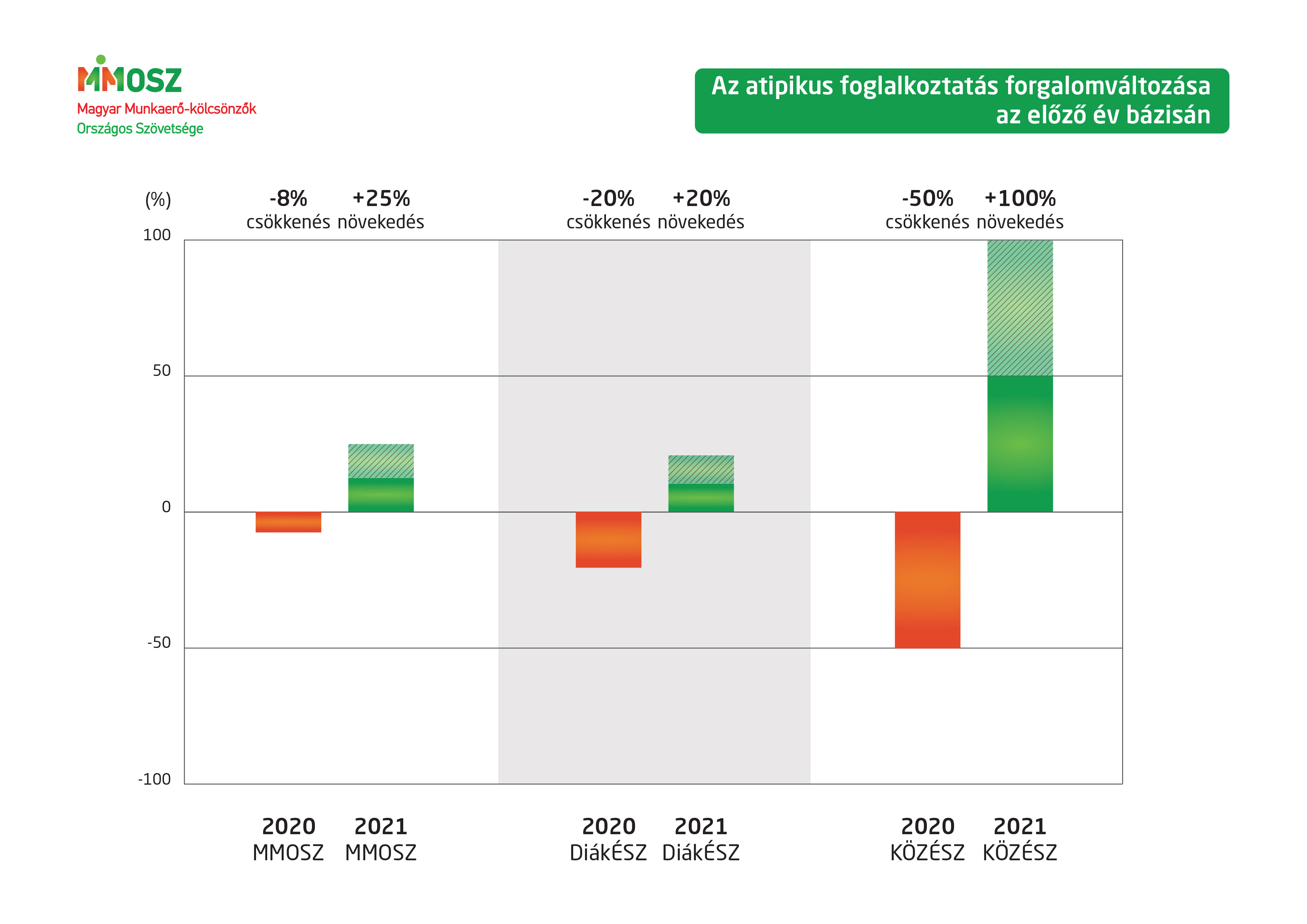 „Azért is szép szám a 8%, mert a rekordindulást követő második negyedév 2020-ban nálunk is 30-50%-os visszaesést okozott, sokan azonban erőn felül próbálkoztak kollégáik munkaviszonyban tartásáért, úgy a fizetett szabadságok, mint az ideiglenes megoldásnak gondolt áthelyezett munkanapok lehetőségével, ami azóta a legtöbb iparágba beépült. Tavaly nyáron már sikeresen toboroztunk: nem volt olyan pozíció, amit ne tudtunk volna határidőn belül betölteni. 2021 első féléve a korábban megszokott volument, a válság előtti forgalmat hozta - amiben persze a február 1-jei 4%-os bérnövekedés is megjelenik -, s úgy látjuk még ezt is felülmúlja majd az évzárás” – foglalta össze tapasztalatait Dénes Rajmund Roland, az MMOSZ elnöke. Sok cég, amely kormányzati támogatást kapott létszáma megtartásához, úgy kívánta feltölteni a kiesők pótlását, hogy saját állományba vették át a kölcsönzött munkatársakat. Kettős helyzet alakult ki: nőtt a volumen, nőtt az igény, de a kölcsönzési szektorban ezt nem tükrözték a számok, ami nem tartós megoldás, mert hosszú távon ellehetetleníti azokat a munkaerő-szervező HR-szolgáltató cégeket, akik akár évtizedek óta kiszolgálták őket, ideiglenesen azonban mindenki számára előnyös helyzetet teremt és további gyümölcsöző együttműködést alapoz meg.